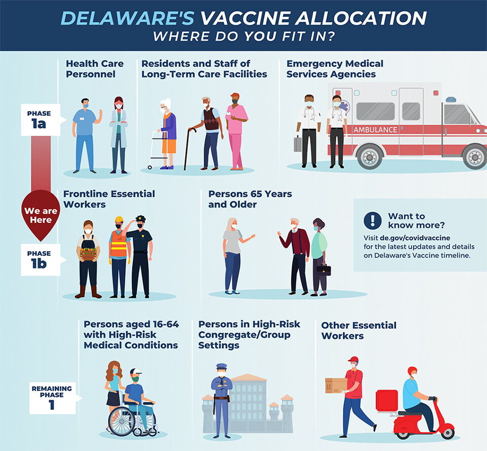 Delaware has begun Phase 1B of its COVID-19 vaccination plan, which includes all individuals 65 and over, and frontline essential workers including: fire, police, correctional officers, teachers and education staff (including child care providers), U.S. postal workers, food manufacturing, agriculture, transportation, and grocery store workers.